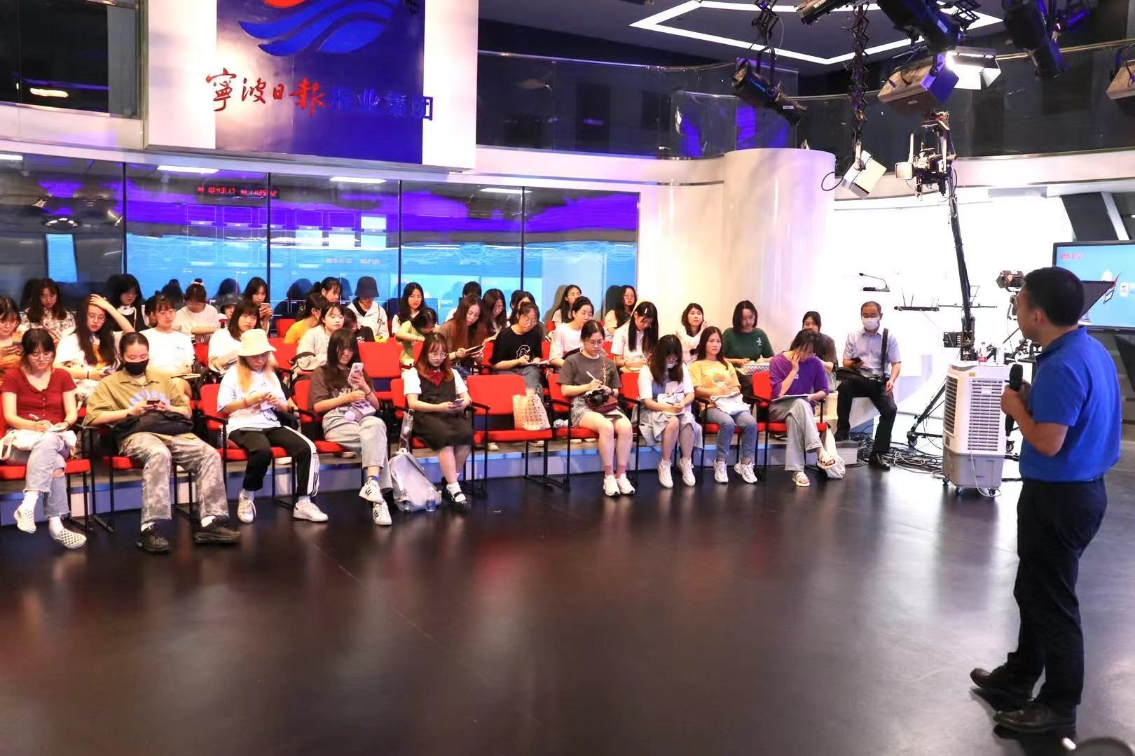 同学们参观了甬派新闻客户端编辑部,了解了媒体融合下的中央厨房运作机制,以及融媒体的新闻生产流程的再造。在三楼宁波日报融媒体演播厅,吴华清结合自身从传媒媒体到新媒体工作的转换经历,给同学们上了一堂生动的新闻实务课。他从新闻生产、传媒技术、媒体运营、媒体管理等四个方面,用生动的例子、幽默的话语,向同学们讲授了媒体融合环境下新闻媒体的变革以及新闻工作者的专业素养和能力的提升要求。