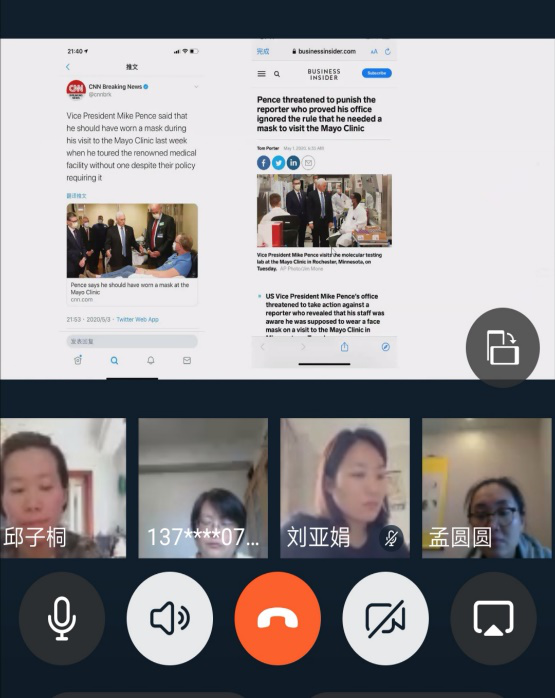 2020年5月6日中午,传媒教工支部的党员老师们在钉钉平台云相聚,召开跨国视频会议,讨论新冠肺炎疫情的全球发展以及学生返校后的心理应对。