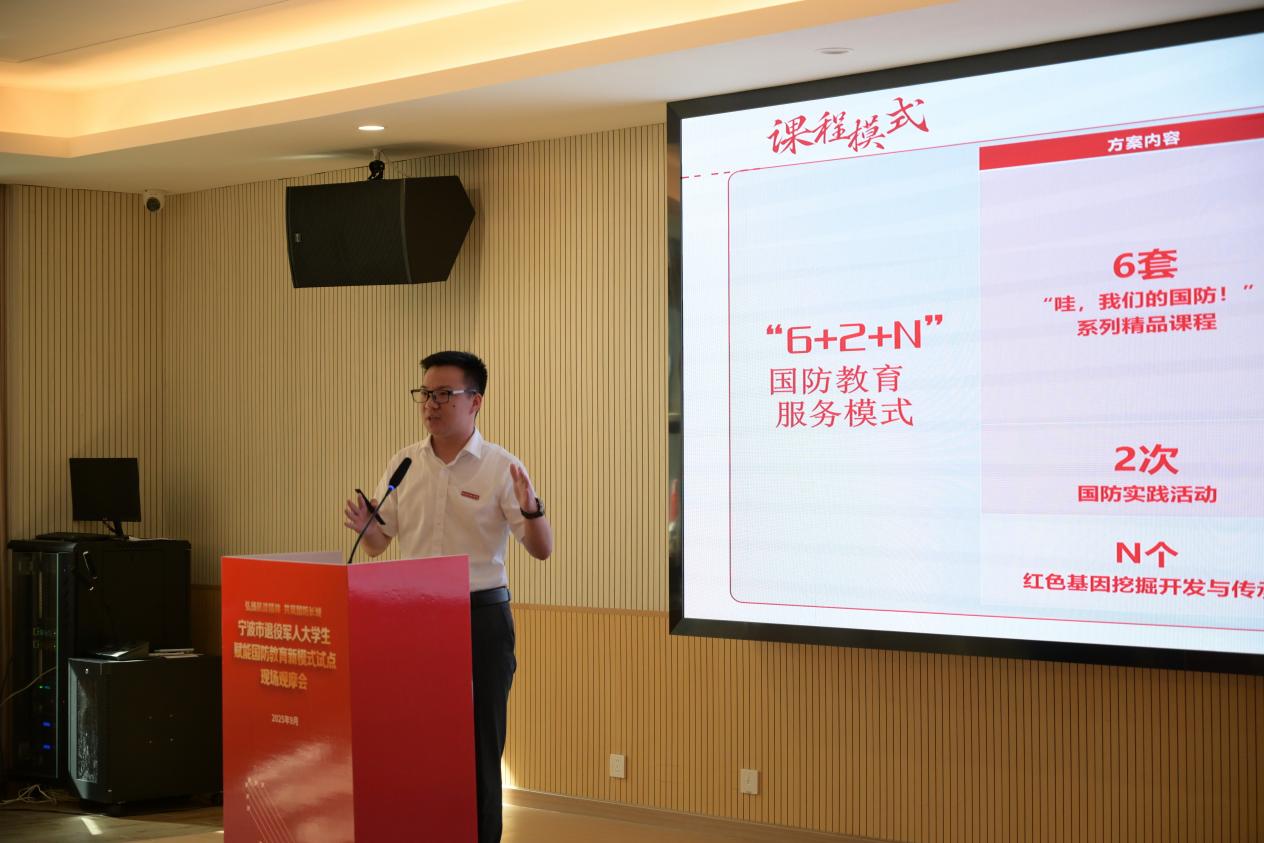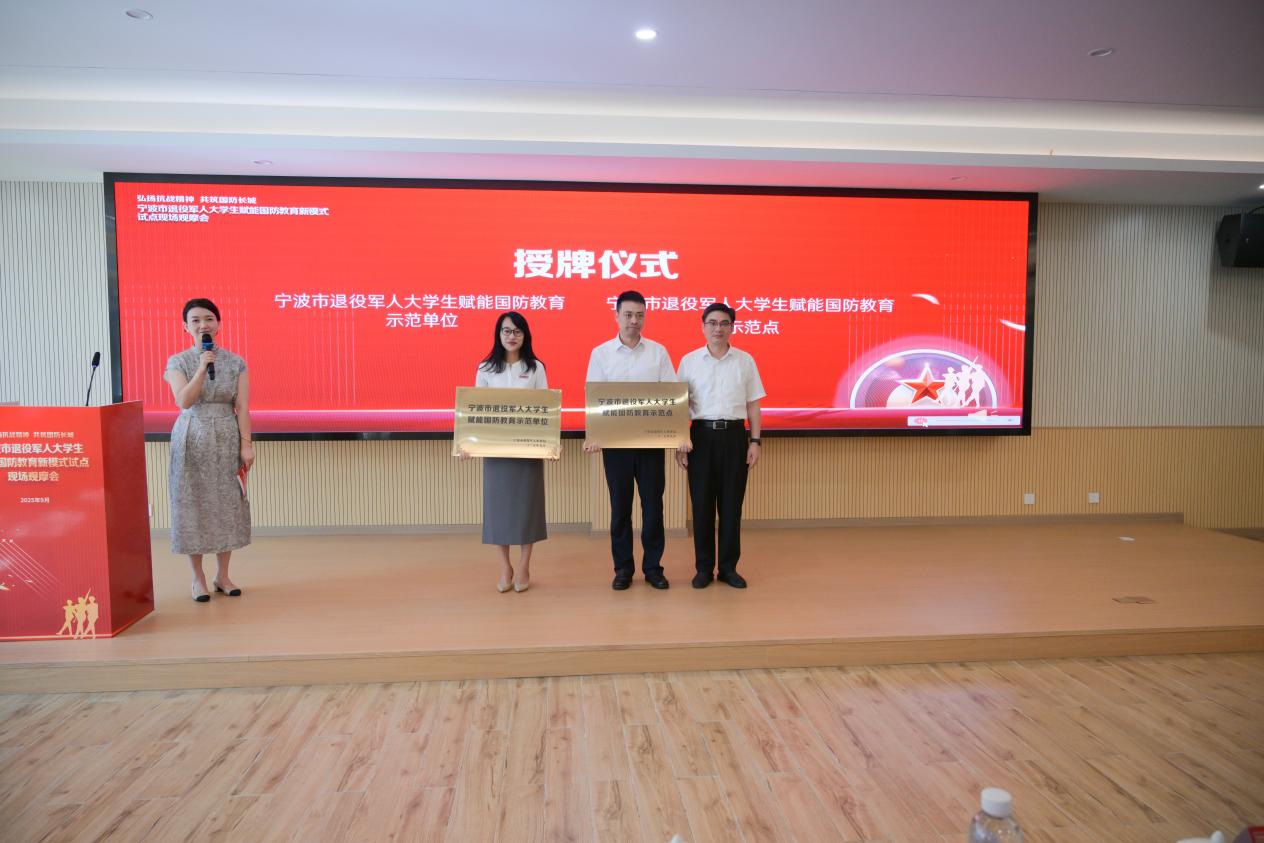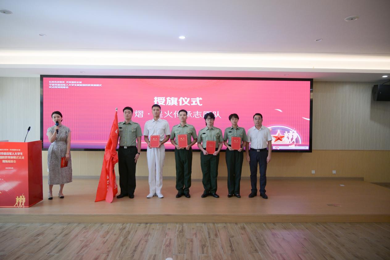 浙江省退役军人事务厅副厅长丁国胜为首批5名“兵教官”代表颁发聘书,同时为“哇,我们的国防——熠·星火传承志愿队”授旗,丁柳强作为志愿队代表表态发言。我校被授予“宁波市退役军人大学生赋能国防教育示范单位”。浙江省退役军人事务厅相关负责人指出“退役军人大学生是兼具军人素养与青年活力的重要力量,应当积极发挥以身示范、以行育人的独特优势,引导广大青少年增强国防观念、筑牢理想信念,让红色基因在他们心中深深扎根、代代相传”。