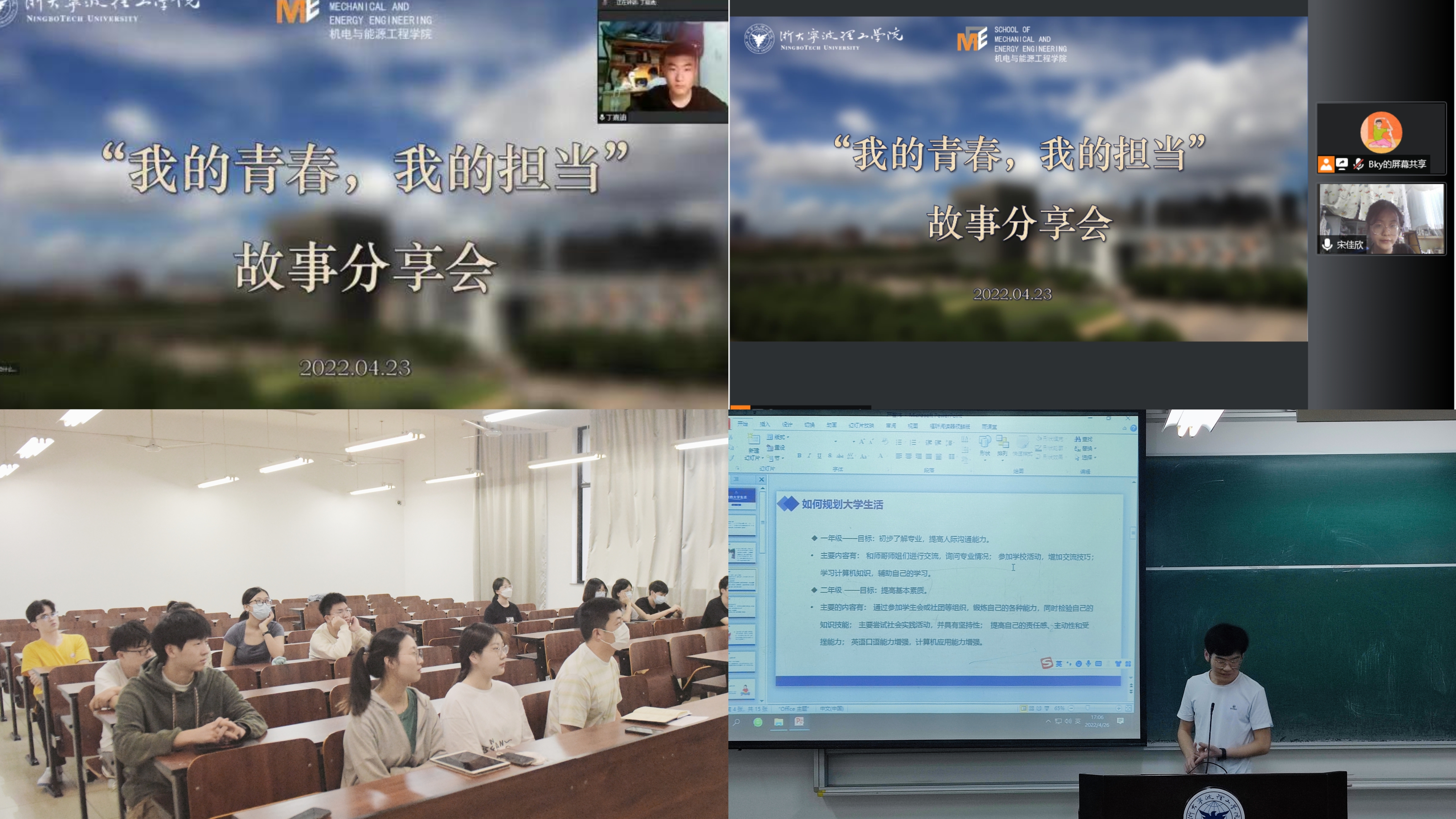4月23日,机能学院通过线上会议方式,邀请了四位来自不同专业的优秀学生代表:宋佳欣、傅磊、丁嘉迪、张坚源,为大家分享考研经验。宋佳欣同学分享了学科竞赛经历,干货满满,同时呼吁同学们多参与学科竞赛、科研实践等活动。傅磊同学是一名退伍大学生,已被东北电力大学研究生院拟录取,他分享自己两年的部队生活带给自己的成长经验,同时也鼓励大家不管是在学习上还是生活中都要有坚持的意志。来自能源专升本201班的丁嘉迪同学已被北京工业大学研究生院拟录取,他分享了自己的考研经历,给予同学们学习方法的建议。张坚源同学向我们分享了他的学生工作经历和考研经验。作为主要学生干部,他跟同学们分享了如何把握学生工作和学习之间的平衡关系,做到学习工作两不误,全面发展。