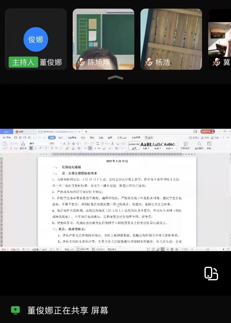 4月12日,学院针对毕业班与非毕业班分别召开线上班长会议,传达学校校园疫情防控要求。会上,学院首先对近期私自出校、出市等违反校纪校规行为进行通报,请各班提醒学生引以为戒,遵守疫情期间学校防疫规定。会上针对校园防疫管理升级,再次强调相应防控要求,同时强调班长要凝聚班委、党员力量,关注关心疫情期间班级同学的情绪、思想和学习状态,提高思想站位,共同为学院疫情防控努力。