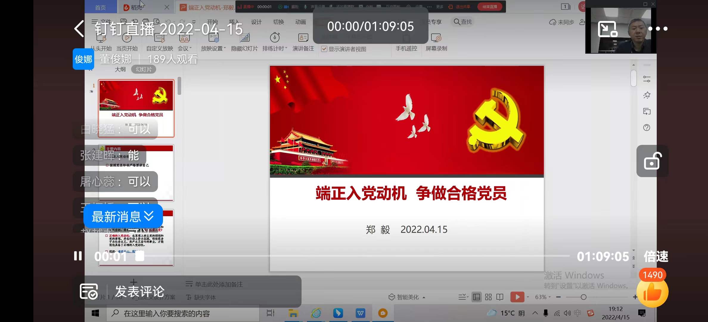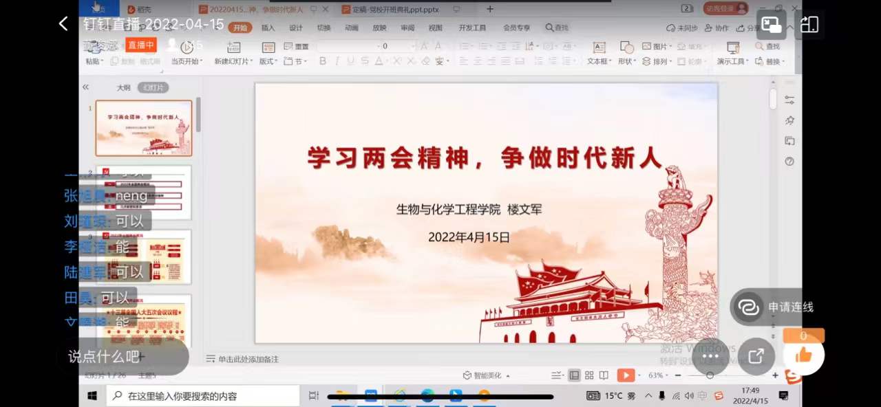 4月15日,党校第42期入党积极分子培训班生化学院党委、数据学院党委、材料学院党委和信息学院党委联合教学班顺利开班。根据疫情防控工作要求,本次开班典礼及培训采用线上直播方式。生化学院党委副书记楼文军、数据学院思政主管王常青、生化学院思政副主管闫雪茹、材料学院思政副主管包静昇出席了此次开班典礼。仪式由信息学院董俊娜主持。