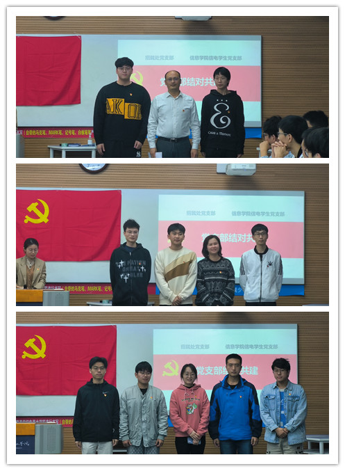 在支部结对基础上,招就处党支部党员教师们与信电学生党支部毕业生学生党员也一一结对,在学生就业过程中进行思想引导、就业、升学指导。
