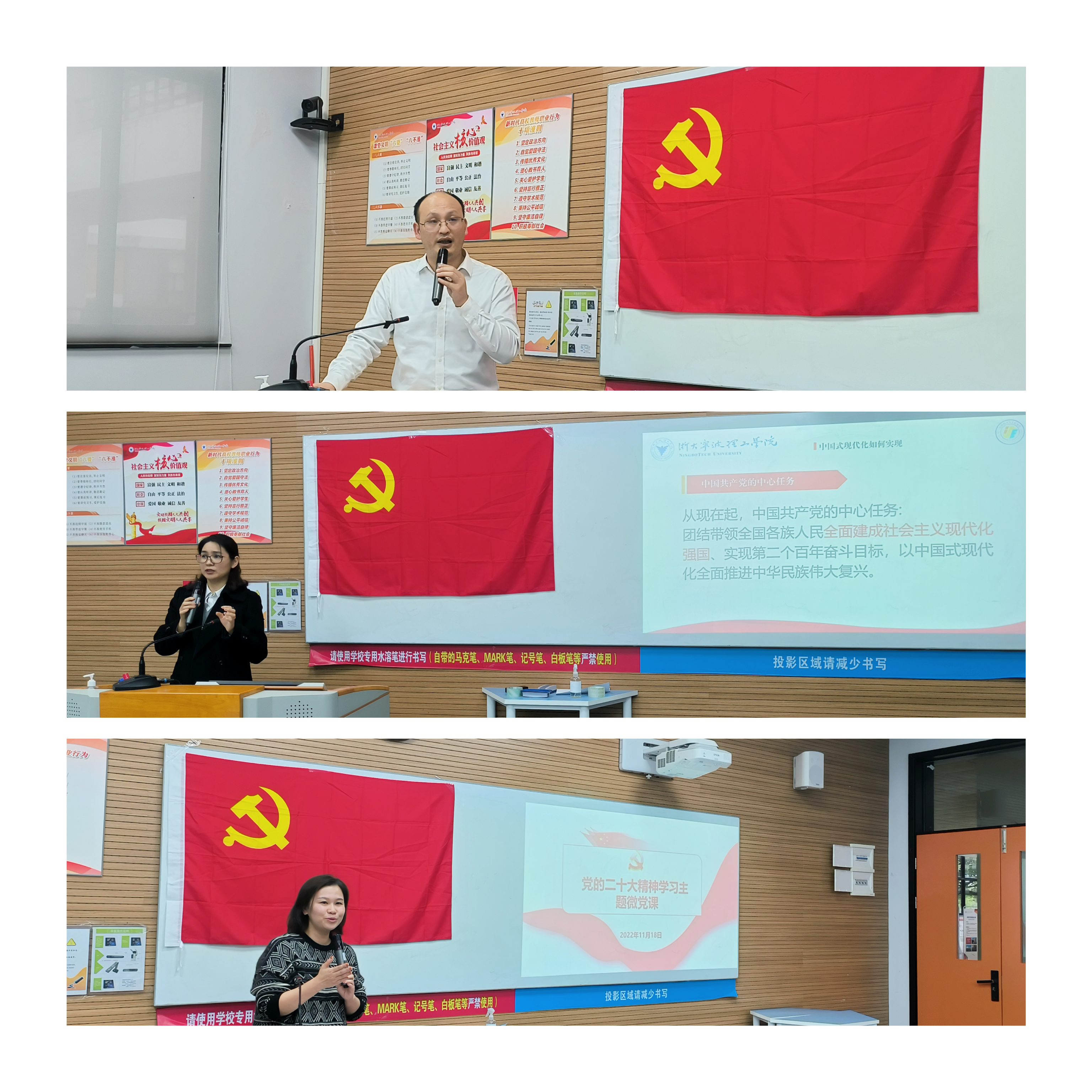 会上双方支部开展了党的二十大党课学习。招就处党支部书记郑剑围绕党的二十大报告中关于就业的论述,从招生、高考改革、就业等贴近同学们的角度进行讲解,他强调社会不断加强制度建设,拓展就业领域,这一系列举措都是为了完善就业服务体系,提升就业质量,同时也促进了学生更全面健康地发展,最后他表示希望同学们在就业季抓住时机,顺利毕业就业。信息学院马利文老师带领大家再次学习党的二十大报告,同时结合专业学习、行业发展,强调大学生发展前景广阔,应当掌握过硬的专业知识,提高综合素养,时刻不忘初心,牢记责任担当,将个人价值实现与时代奋进目标结合起来,在不懈奋斗中实现人生价值。招就处党支部张硕老师结合党的二十大报告重点分析了当前高校毕业生就业形势与社会发展,向同学们介绍了学校招就处在毕业生就业等方面所做的工作,最后她强调家长和毕业生都要对就业有理性的认识,毕业生更要眼光放长远,努力树立自强自立的就业观。