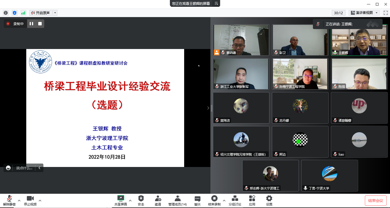 10月28日下午,桥梁工程课程群虚拟教研室第一次会议在线上顺利召开。参加会议的有昆明理工大学、浙江工业大学、浙江理工大学、浙大科技学院、浙大城市学院、绍兴文理学院元培学院、宁波大学、宁波工程学院、台州学院等高校桥梁工程教师,土建学院部分教师参加了会议。会议由浙大宁波理工学院土建学院土木工程系主任彭卫教授主持。
