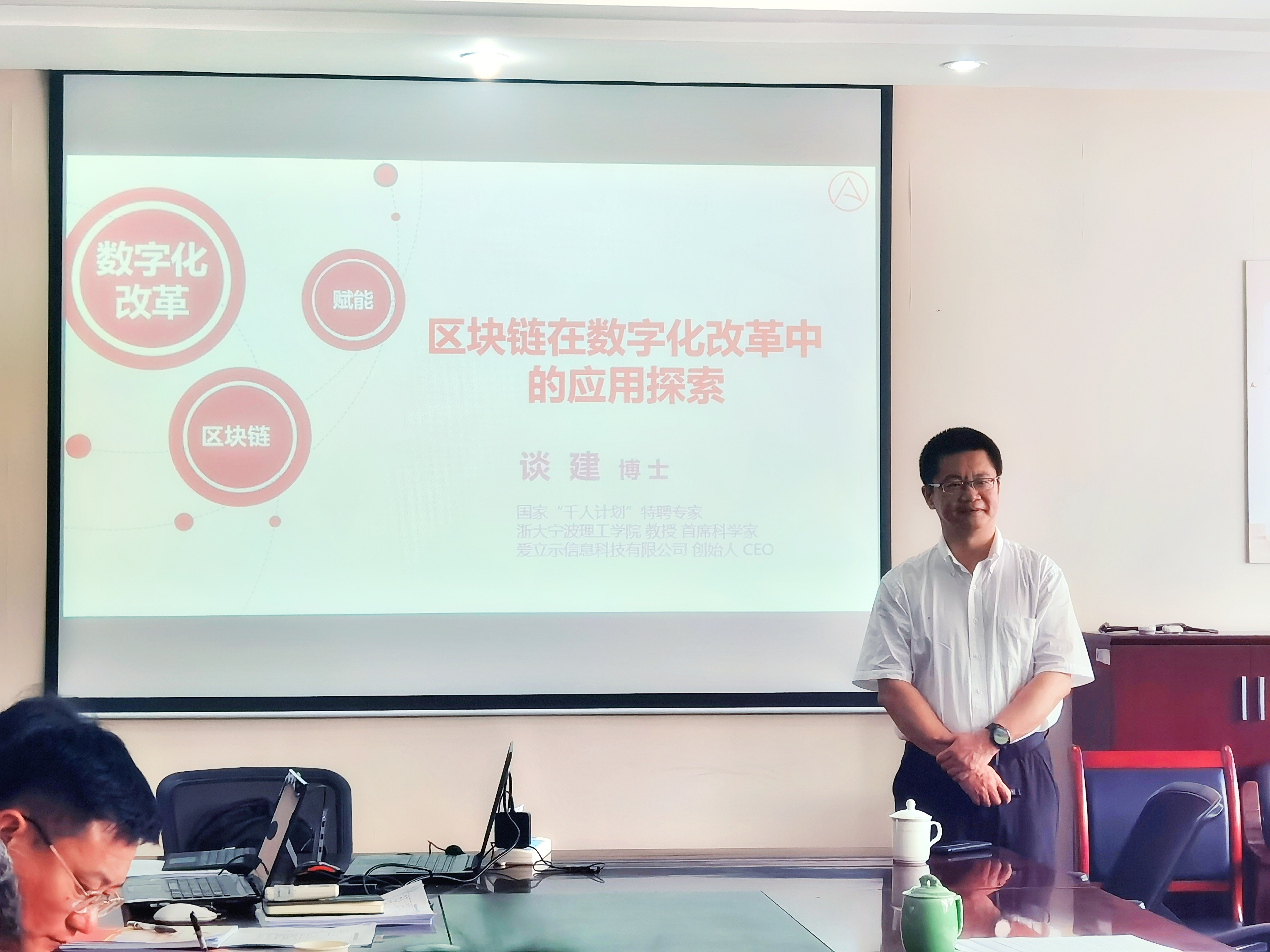 报告会上,谈建教授以“区块链在数字化改革中的应用探索”为题作了专题报告,详细介绍了区块链技术的背景、定义、特点、无钥签名区块链技术以及在各类数字化场景中的应用,重点介绍了在土木建筑和交通运输行业的技术与管理,以及水处理与水环境等场景的应用案例,强调在数字化改革大背景下,区块链已成为数据可靠性和安全性的技术保障,是数字时代建立诚信的基础设施。