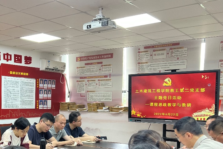 土建学院教师积极响应教育部号召,围绕自己的教学科目开展了各类课程思政教学与教研工作,但仍有部分教师尤其是新进教师对课程思政的认识和理解存在不足,缺乏相关工作经验。为了提高教师普遍课程思政能力,学院教工第二党支部于2022年6月22日在党员之家召开了“课程思政教学与教研经验交流会”。会议由党支部书记方鹏飞教师主持,由马佳星和方鹏飞作为主要汇报人向支部全体党员分享了其课程思政教研项目的申报心得和经验,以及教学过程中如何将思政元素融入课堂,进而达到高质量的教学和育人目标。
