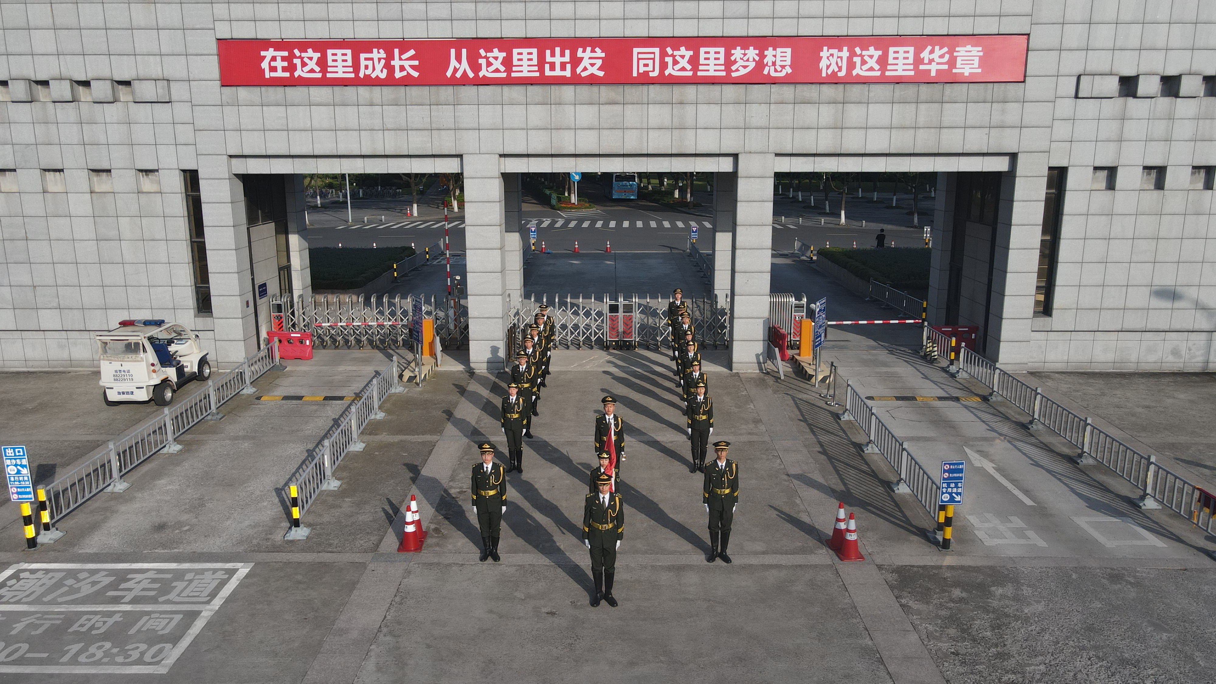 迎着朝阳,国旗护卫队队员迈着铿锵的步伐来到了国旗台下,全场一片肃静。全体师生面向国旗庄严肃立,行注目礼,伴随着庄严激昂的国歌,五星红旗冉冉升起。