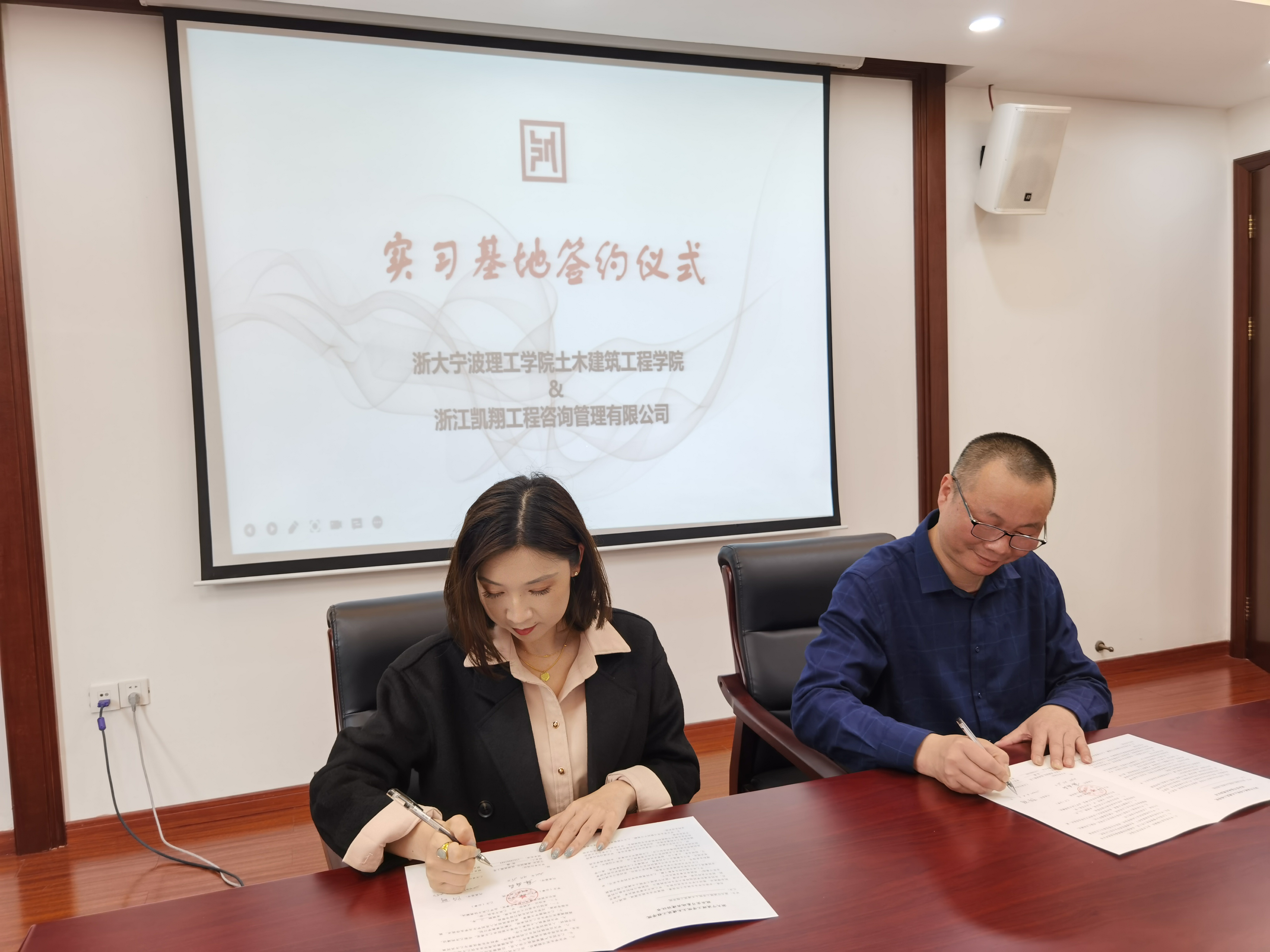 浙大宁波理工学院土木建筑工程学院党委副书记韩晶晶、思政主管张腾,浙江凯翔工程咨询管理有限公司总经理史乐、副总经理王凯翔等出席签约仪式,并开展座谈交流。