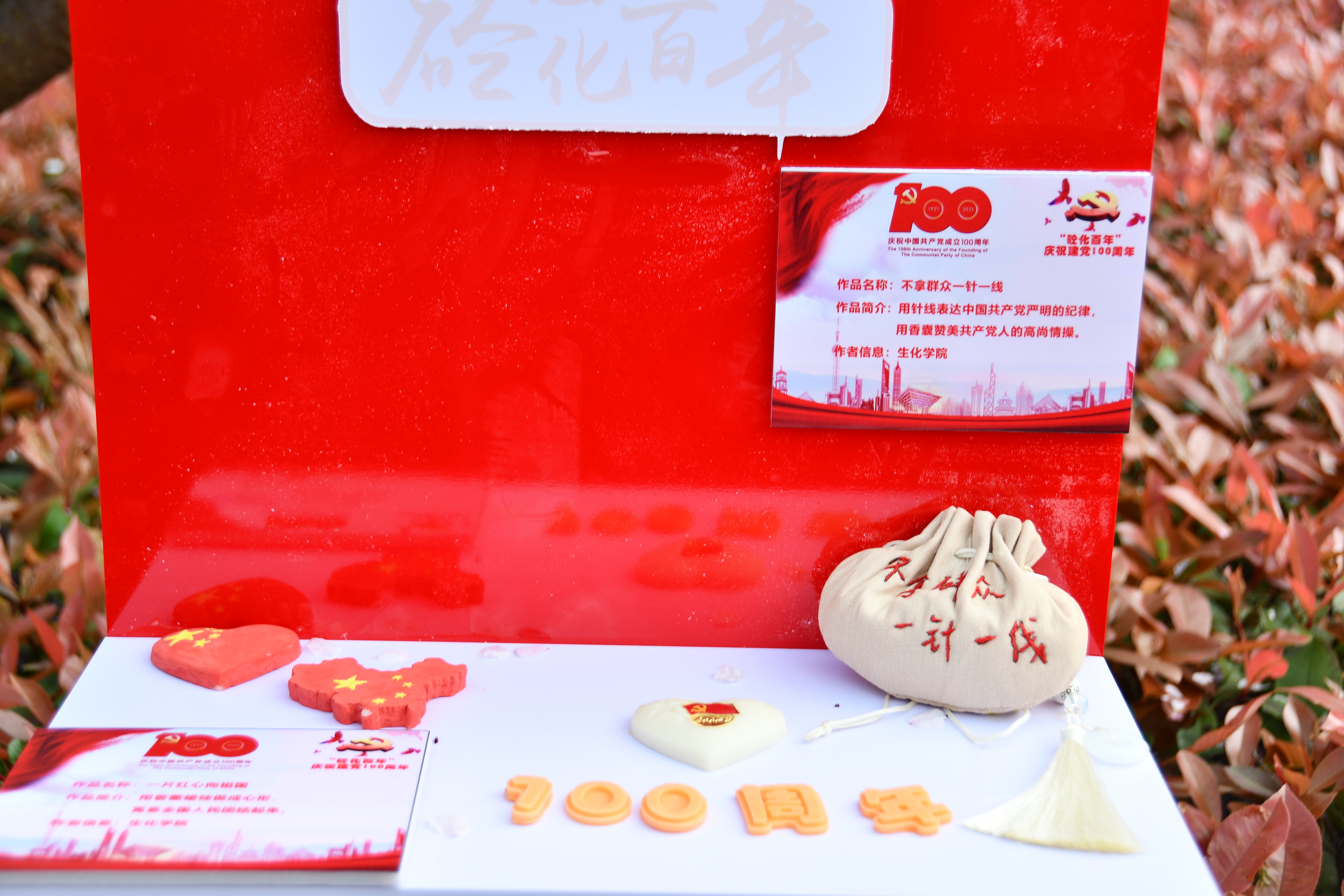本次展览展出了两个学院学生党员和入党积极分子为庆祝建党100周年,结合各自专业特色亲手制作的各类作品。有来自土建学院的书法作品、木制搭建的奥运五环、太和殿、世博会中国馆、北斗卫星以及“老虎”、“苍蝇”一起打的反腐倡廉作品等;有来自生化学院的由肥皂、滴胶、布艺等制作而成的“我的中国心”、党旗党徽、南湖红船、不拿群众一针一线等作品。机能学院许晨光老师还提供了他的书法作品参展。