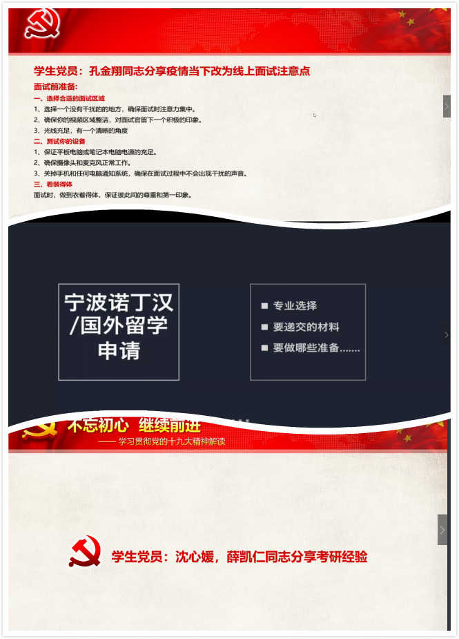 活动还包含了出国留学和考研经验分享。方胜卉同志以宁波诺丁汉大学为例,分享了出国深造所需的准备。沈心媛同志作为跨考研究生,总结了跨考的优劣势。薛凯仁同志分享了他的考研心路历程,“找准自身定位,选择合适院校,不留人生遗憾!”他真诚地说道。