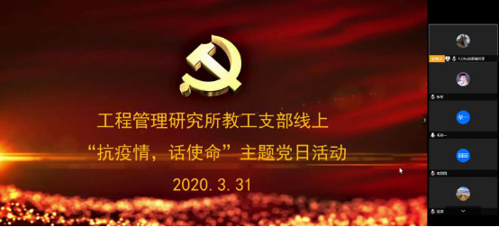 2020年3月31日晚上7点,工程管理研究所教工支部“抗疫情,话使命”主题党日活动利用腾讯会议平台准时开始。