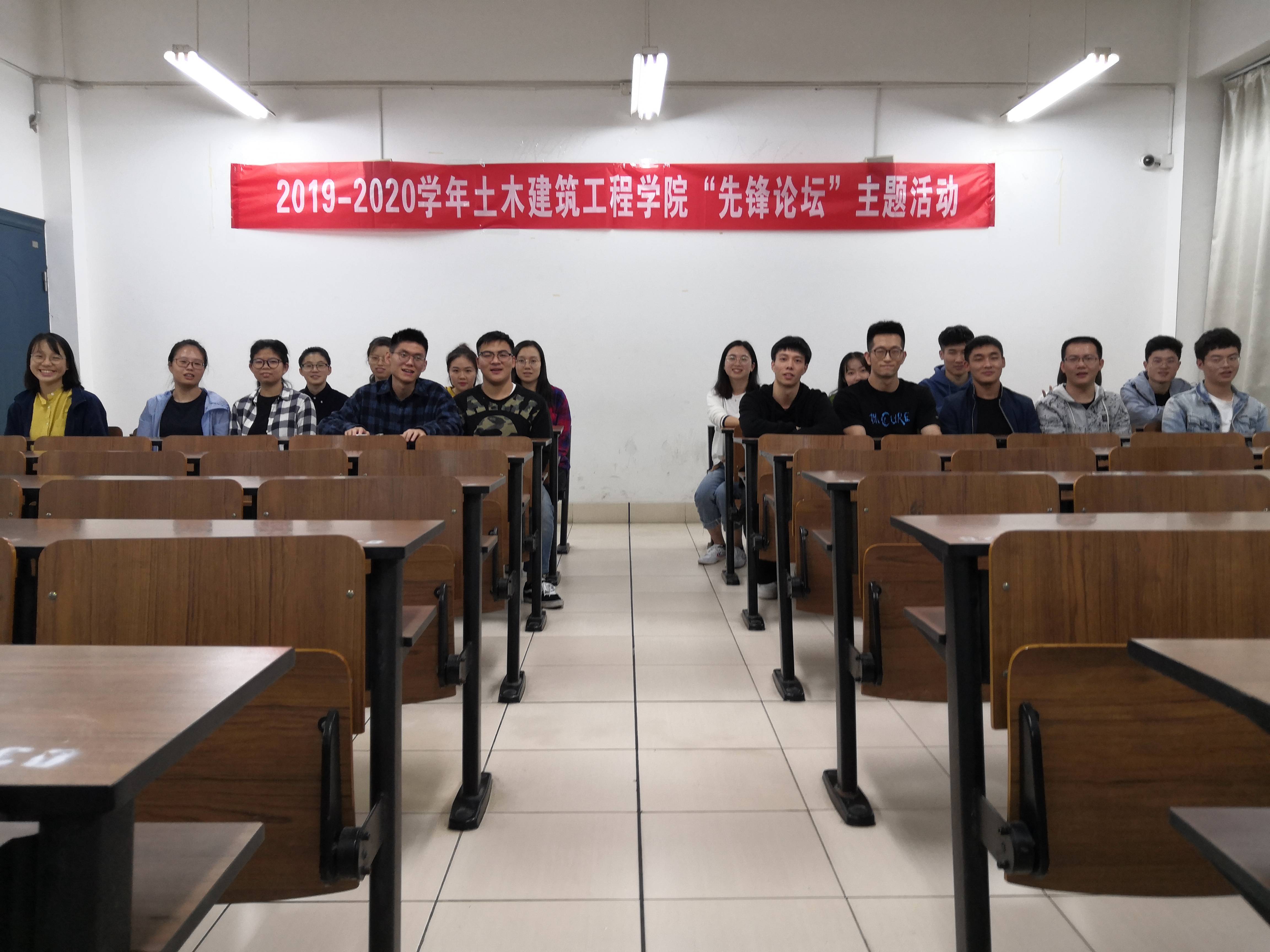 2019年10月25日晚,土建学院红色先锋论坛在SB310举行,此次活动由土建学院道桥学生支部书记周星老师、学院学生主席团成员蒋佩晓、汪挺建带来主题分享。