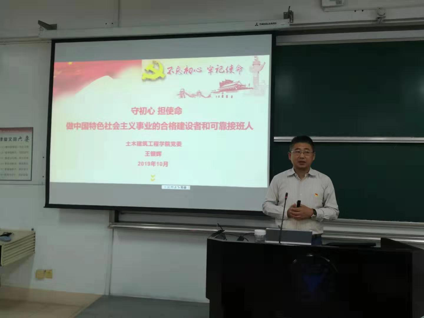2019年10月19日,土木建筑工程学院“守初心、担使命,做中国特色社会主义事业的合格建设者和可靠接班人”主题教育开课,由土建学院党委书记兼副院长王银辉主讲,土建学院全体学生党员到场听讲。
