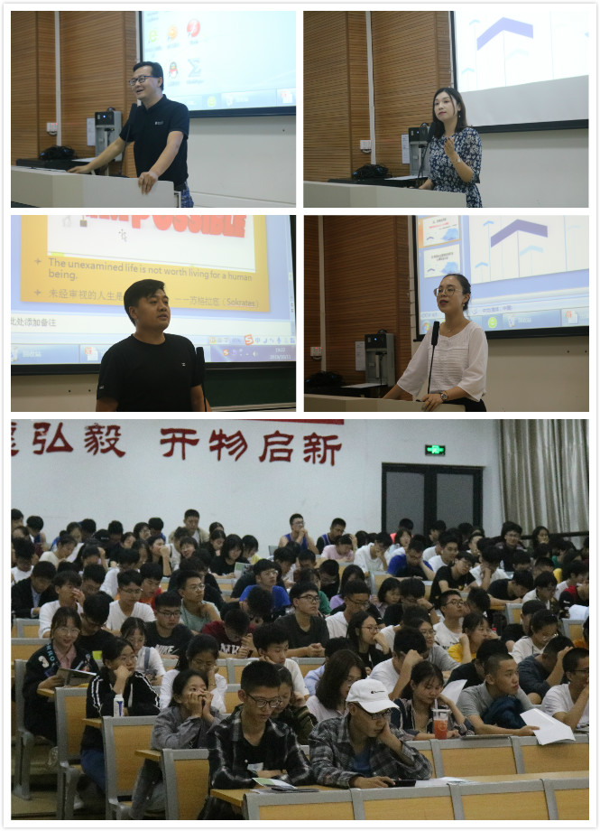 接着,外国语学院副院长蔡亮教授以风趣幽默的方式开始他的“土为路,木为马,仗剑走天涯”主题分享。他从“打开你面前的窗”、“推倒你面前的墙”、“做你自己的太阳”、“哪片云彩不飞翔”四个层次层层递进,讲述了自己出国的经历以及学校一些同学通过自己努力创造机会的出国交流事迹,向同学表达了“世界认识你不是因为你和别人相同,而是因为你和别人不同”的理念,“国际视野”是一个人的核心竞争力的重要部分,我们想要变得不同,可以通过探索自我、自然、人类、改造世界来实现。然后,他通过阳明文化引入“知行合一”的理念,他说:“世界就是你的施工现场”,只有不断的探索,才有可能发生,这引起了新生们的思考。
