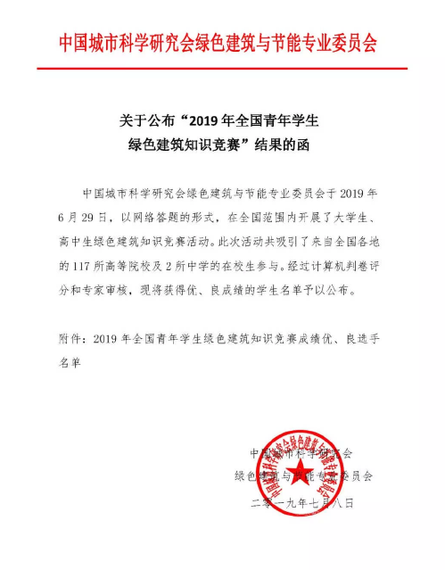 2019年6月28日,中国城市科学研究会绿色建筑与节能专业委员会以网络答题的形式,在全国范围内开展了大学生、高中生绿色建筑知识竞赛活动。此次活动共吸引了来自全国各地的117所高等院校和2所中学的在校生参与。学校有两名同学取得良好成绩,分别是建筑15级郑楚睿和道桥16级金展潇。