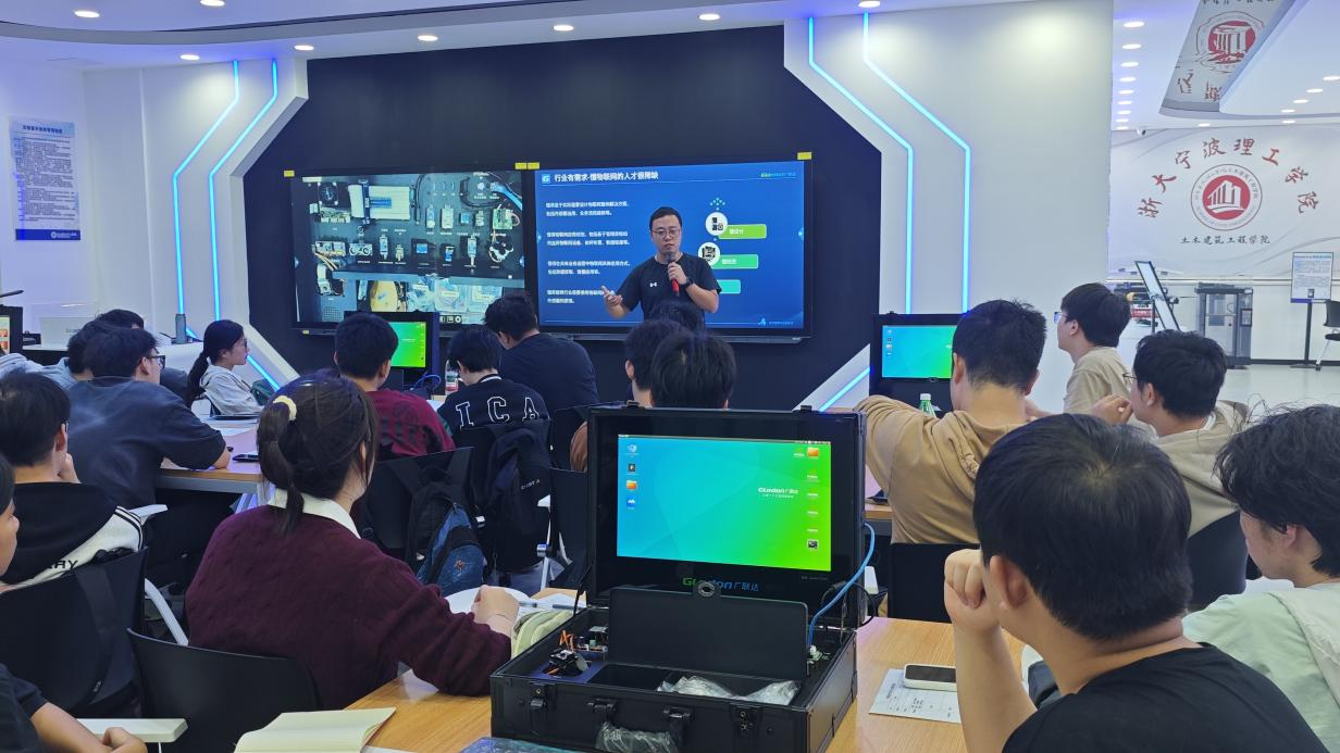 近日,土木建筑工程学院土木工程实验中心新近完成一期建设的数字建造实验室正式投入使用,并迎来了它的“开门第一课”——《传感器与检测监测技术》实验环节《建筑人工智能物联实训台实践》。本次课程特邀行业领军企业广联达科技的资深专家孙瑞志老师授课,标志着学院在智能建造领域的人才培养迈入了产教融合、虚实结合的新阶段。