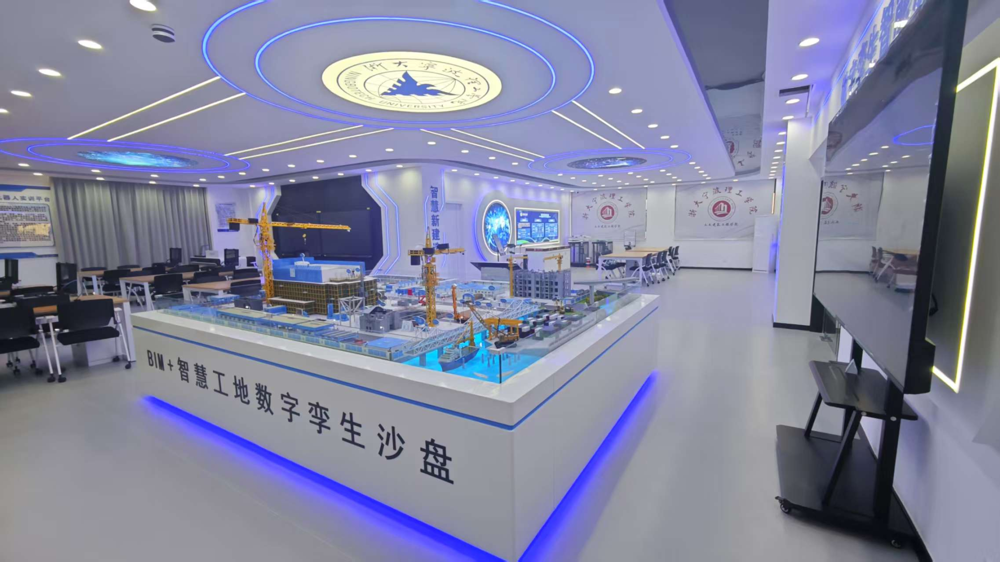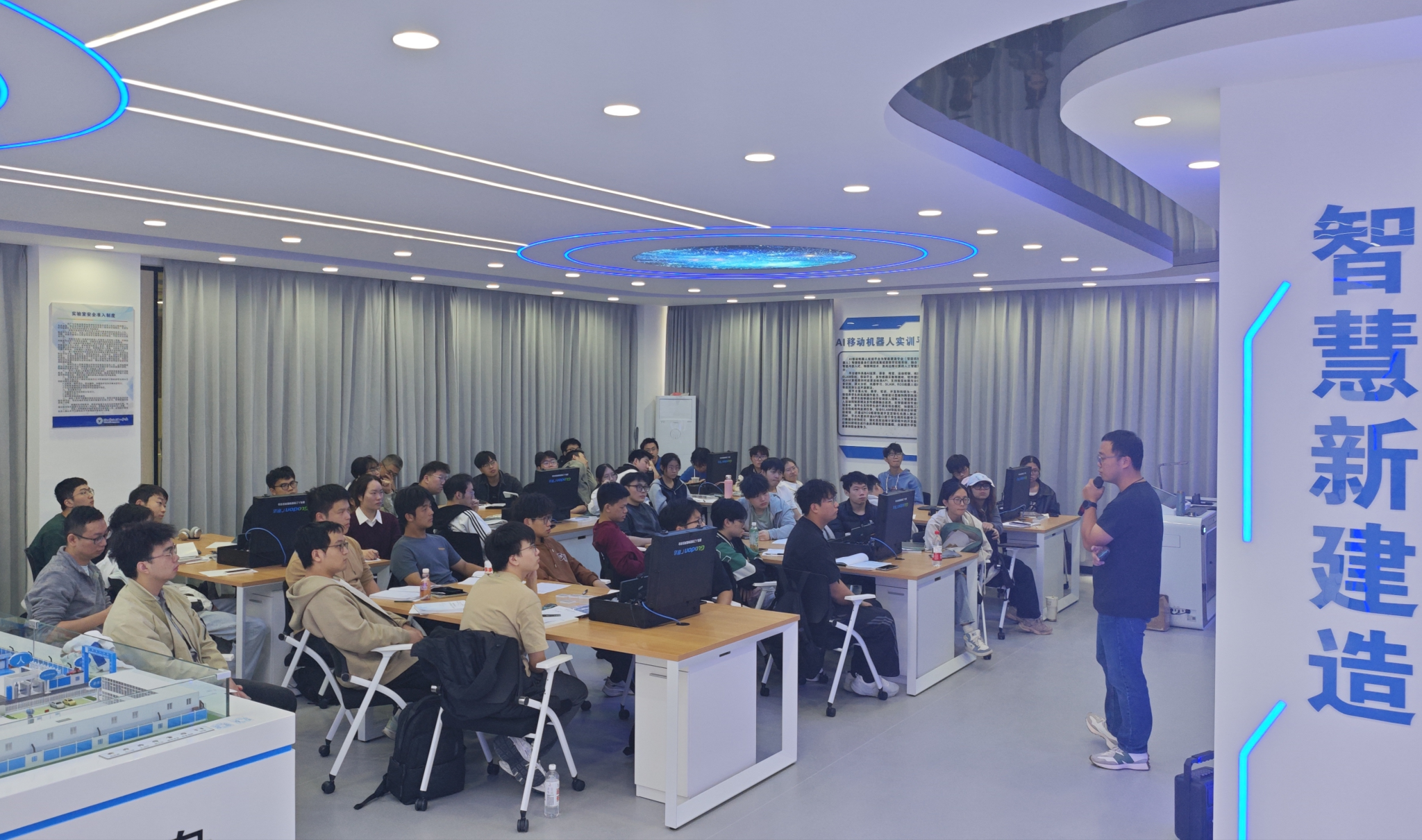 全新的数字建造实验室面貌焕然一新,BIM+智慧工地数字孪生沙盘、AI移动机器人、物联网传感器集群等先进设备一应俱全,为同学们营造了一个充满科技感与未来感的学习环境。