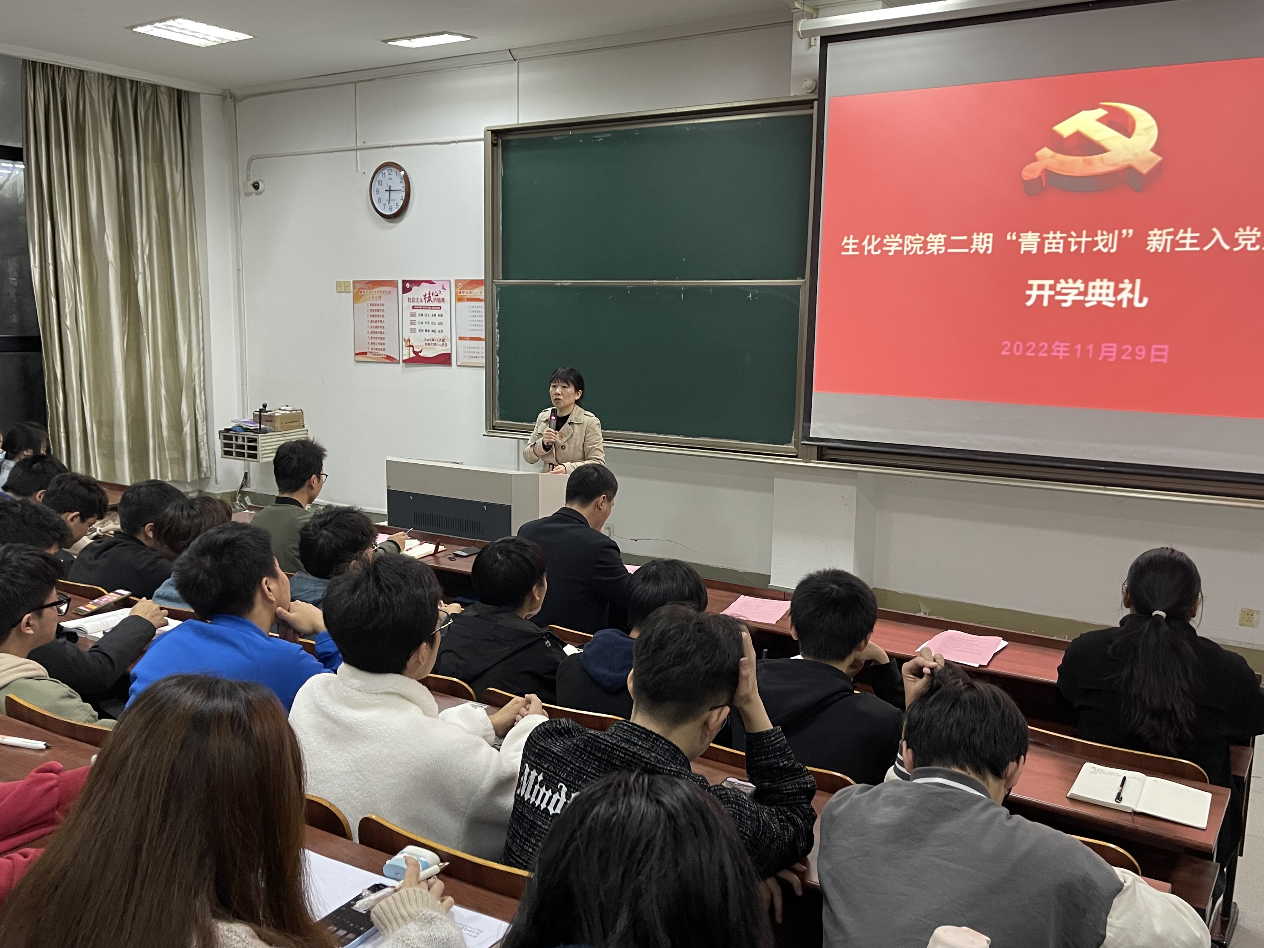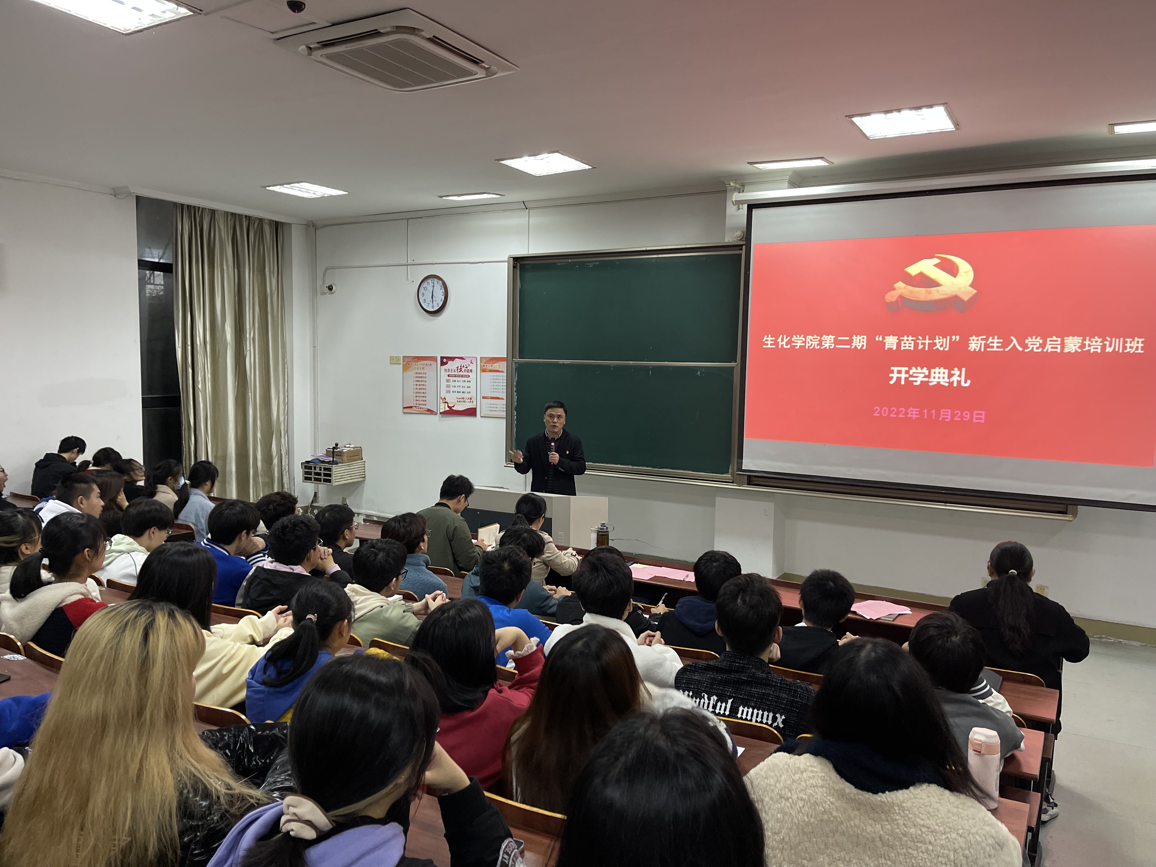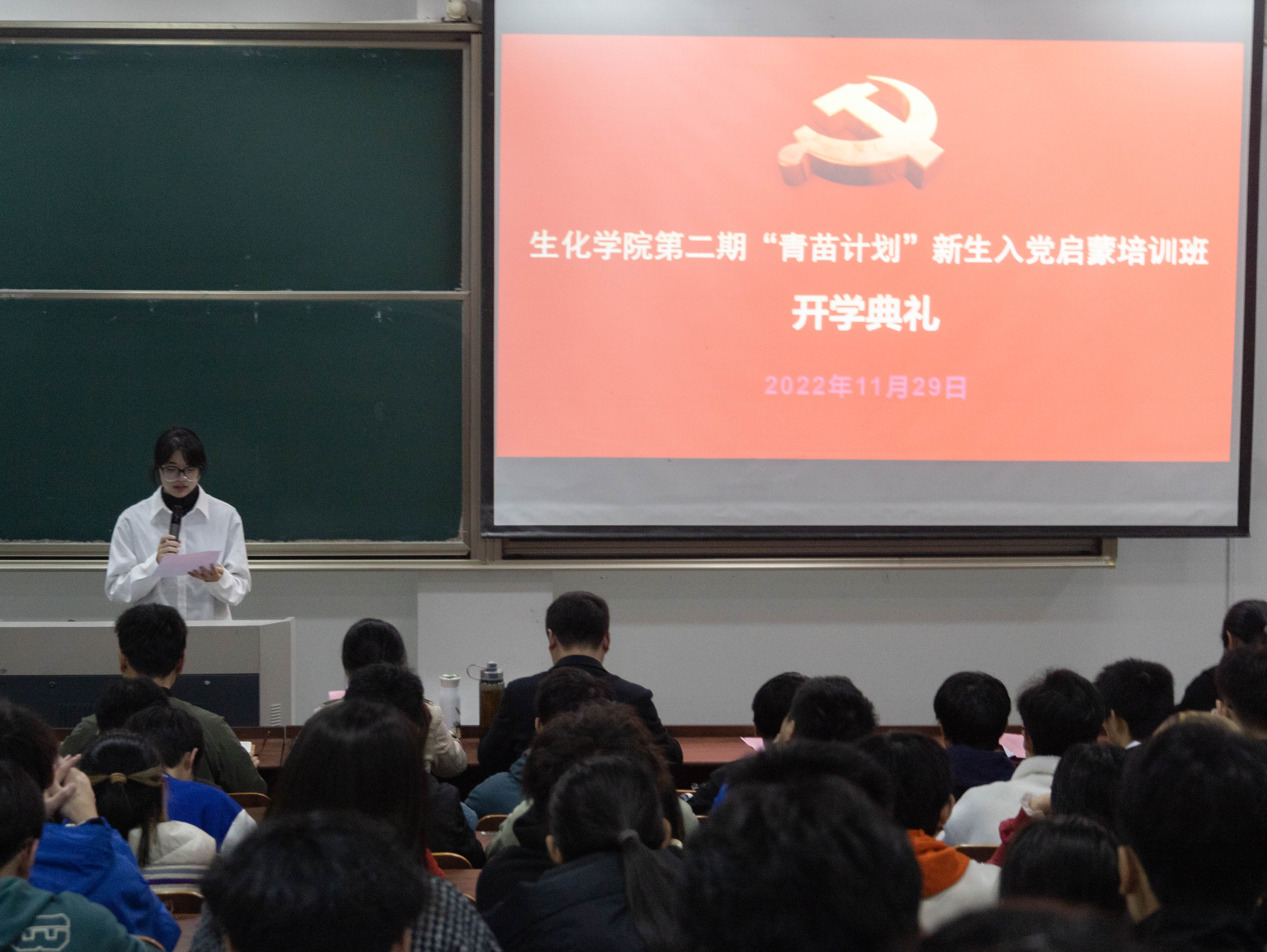 为认真学习贯彻党的二十大精神,端正递交入党申请书新生的入党动机,11月29日晚,生化学院党委在SF104举行第二期“青苗计划”新生入党启蒙培训班开班典礼。参与典礼的领导老师有生化学院党委书记楼文军,生化学院党委副书记、纪委书记王常青,以及生化学院学生党支部书记。典礼由学生第二党支部书记董文举主持。