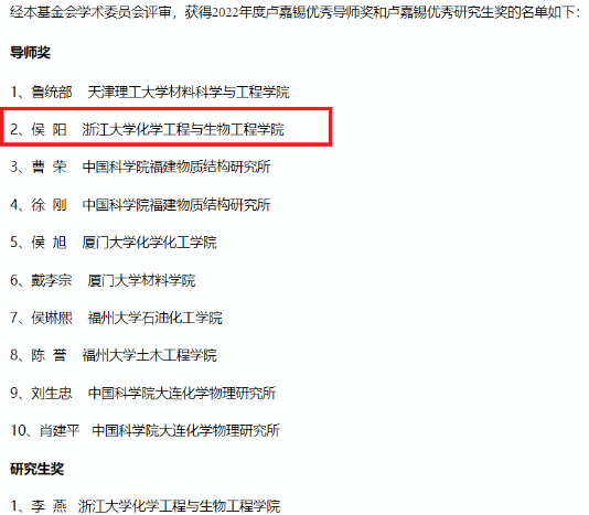 近日,经卢嘉锡科学教育基金会学术委员会评审,2022年度卢嘉锡优秀导师奖揭晓,我院院长侯阳研究员荣获2022年度“卢嘉锡优秀导师奖”,颁奖仪式将在中国化学会第八届全国结构化学学术会议开幕式上举行。同时,侯阳研究员指导的李燕博士生获得了“卢嘉锡优秀研究生奖”。