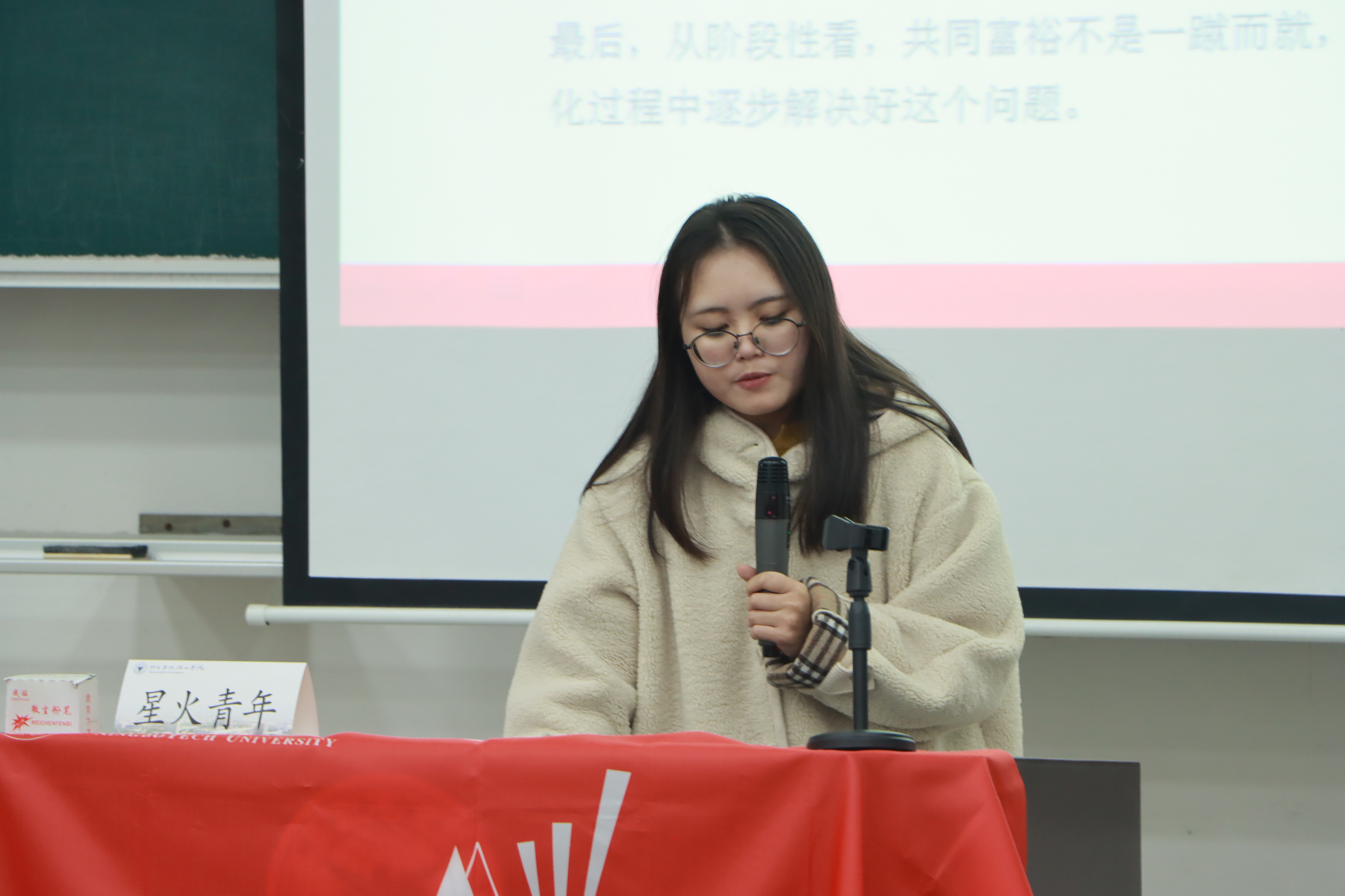 此次,星火宣讲团的成员们也开展了宣讲。陈雯和陈怡两位同学分别以“和平方舟”精神以及共同富裕为主题,结合自身经历,讲述当下时代楷模和时政热点。表明当代大学生应当努力学习,提高自身素质,在“重要窗口”写下青春的绚丽光彩。