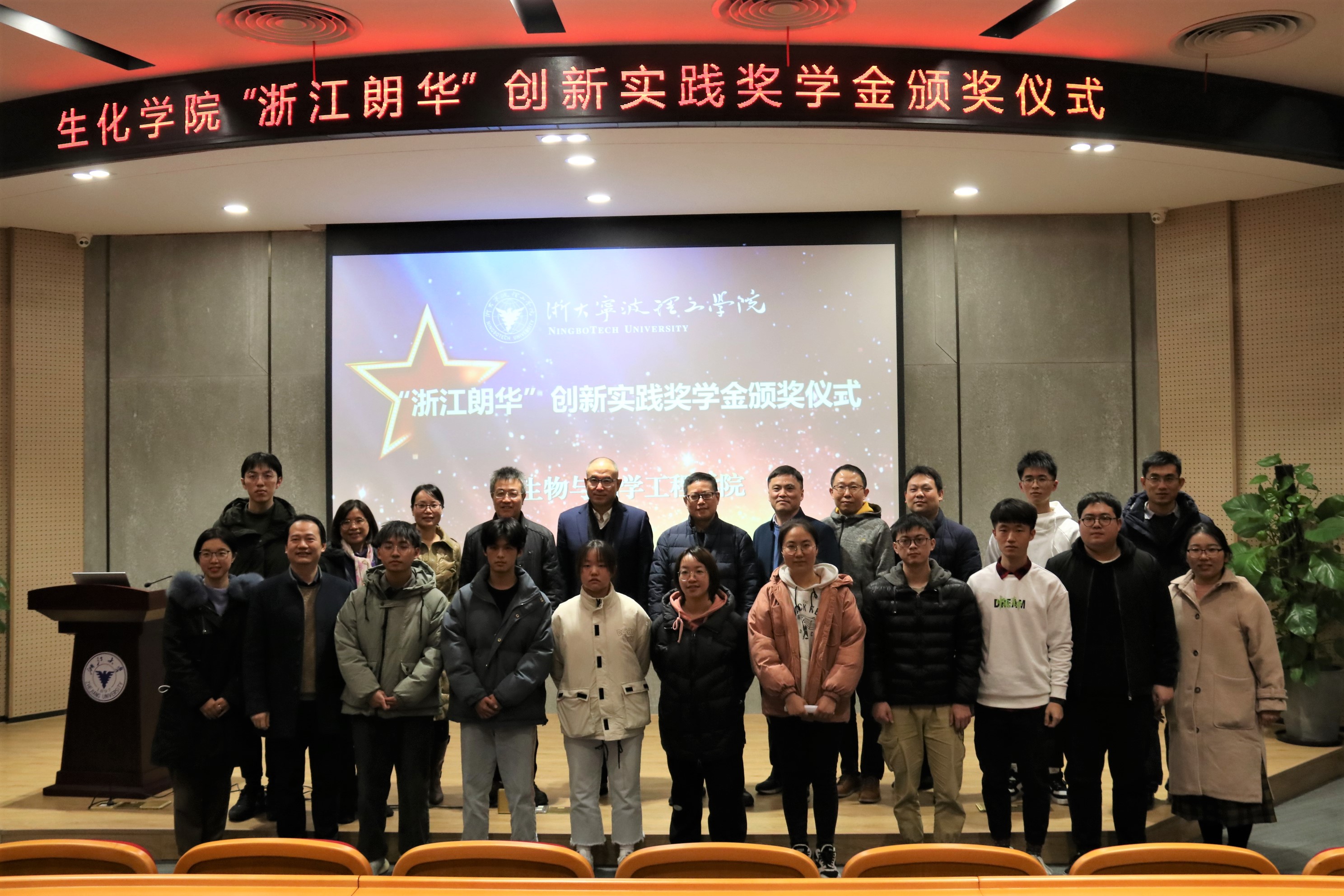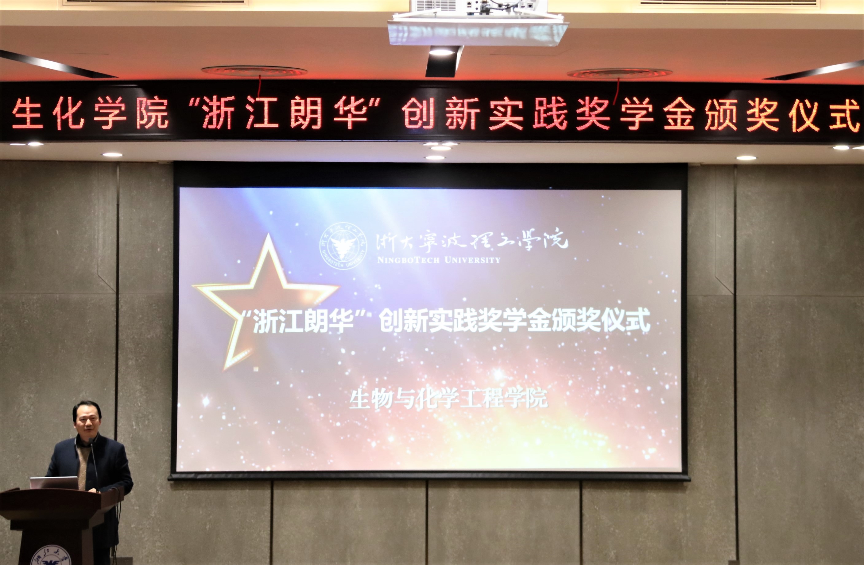 浙大宁波理工学院生化学院于2020年12月21日在启新大讲堂举行2019—2020学年“浙江朗华”创新实践奖学金颁奖仪式。参加本次颁奖仪式的企业嘉宾有中宁化集团董事长单孟春、浙江朗华制药有限公司代表王世辉等。浙大宁波理工学院副校长鲁东明、校团委书记周春晓、生化学院领导班子出席颁奖仪式。本次活动由生化学院党委副书记赵涵主持,全体20级新生参加。
