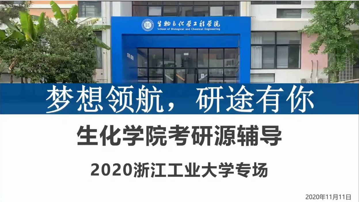 生化学院在11月11日晚上开启了“梦想领航,研途有你”考研源辅导浙工大专场直播活动。本次活动邀请到了浙江工业大学材料学院博士生导师曹澥宏教授、生工学院博士生导师邹树平教授和化工学院研究生辅导员叶贝贝老师。生化学院党委副书记赵涵、学工办辅导员闫雪茹、董文举以及生化学院17级、18级学生参与此次活动。