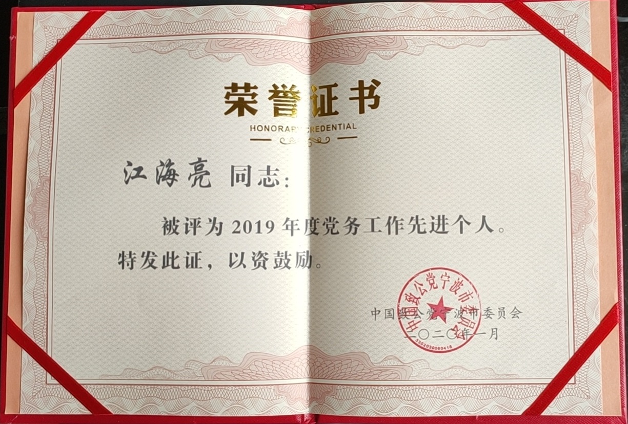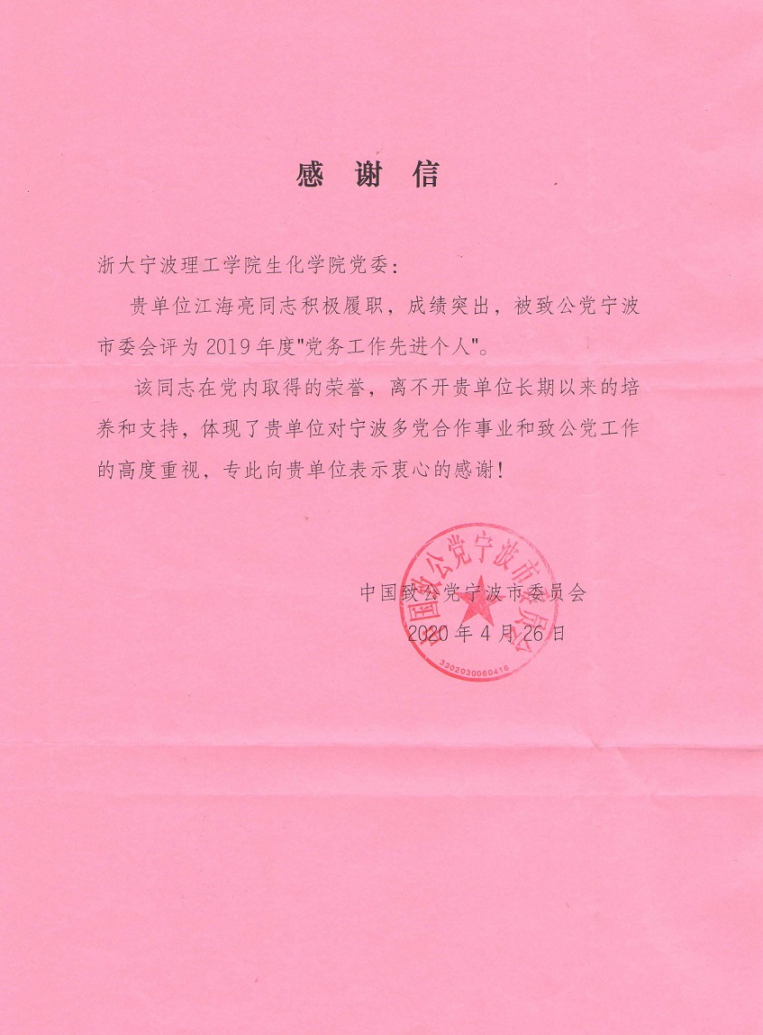 日前,生化学院党委收到致公党宁波市委员会发来的一封特殊信函:江海亮老师因履职成绩突出,被评为2019年度“党务工作先进个人”,致公党市委特来信感谢学院对宁波多党合作事业和致公党工作的支持。