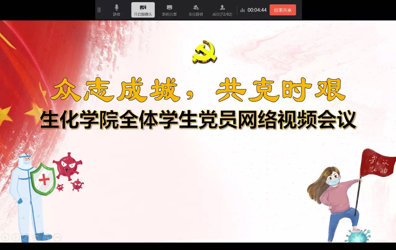生化学院党委召开“众志成城,共克时艰”全体学生党员网络视频会议,开展了一次特殊的爱国主义网络课。党委书记楼文军以“中国疫情防控背后的制度优势”为题做了视频讲座,教育生化学子进一步坚定“四个自信”,强化政治认同、思想认同、情感认同,不断激发爱国之情、强国之志、报国之行。党委副书记、纪委书记赵涵以“中国抗疫的世界意义”为题,就华尔街日报等媒体的不当言论等实例,引导同学们正确认识中国在这场疫情攻坚战中为世界作出的贡献,深度诠释了大国担当。之后,全体学生党员围绕“中国抗击疫情举措凸显的制度优势”和“中国抗击疫情中升华的爱国主义”两个微话题展开激烈讨论,何玲颉、廖冠英、张蓉开等多名学生党员纷纷发表自己的微观点,引来同学们的共鸣。