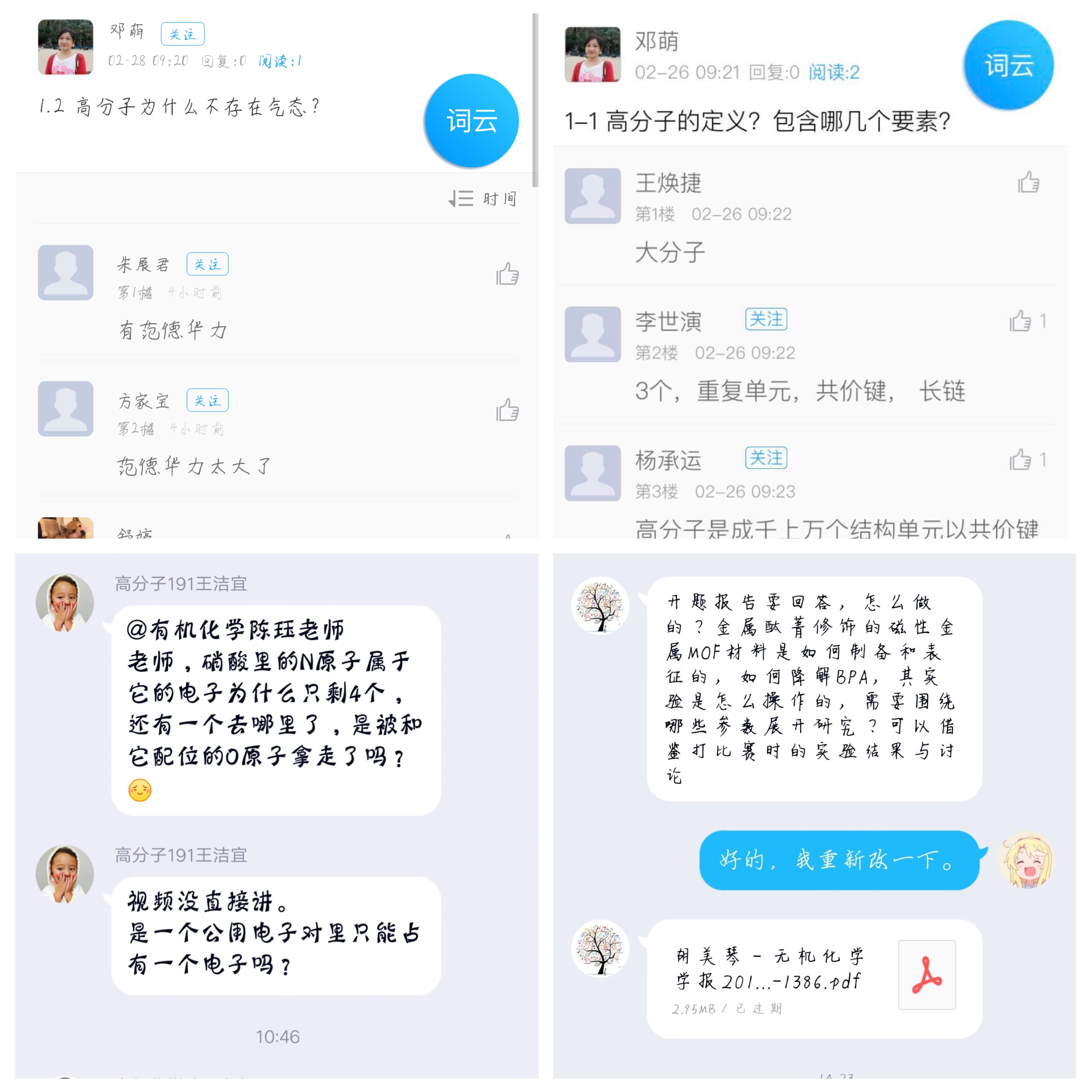 生化学院方征平、邓萌、闫红强、程捷、陈飞组成的团队高度协同,聚焦专业学习的基础理论与核心知识,兼顾公选课需要,分别在线构建“高分子物理”“材料科学与工程基础”“材料与人类文明”课程群。团队克服时间短、任务重,资源少、硬件缺,网络限制、软件限制等困难,抓住机会促进课程转型升级,做好信息时代的教学改革。