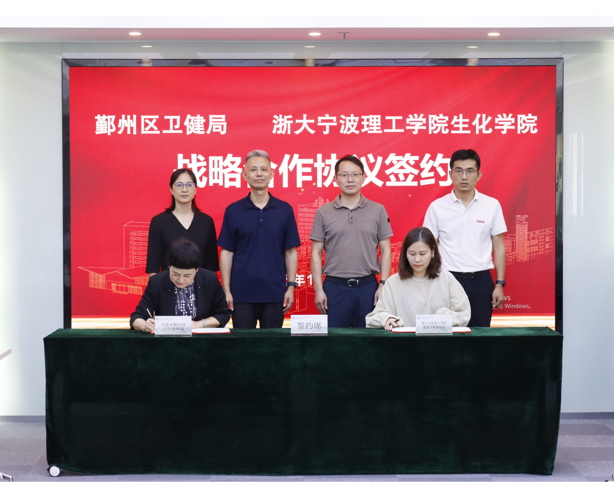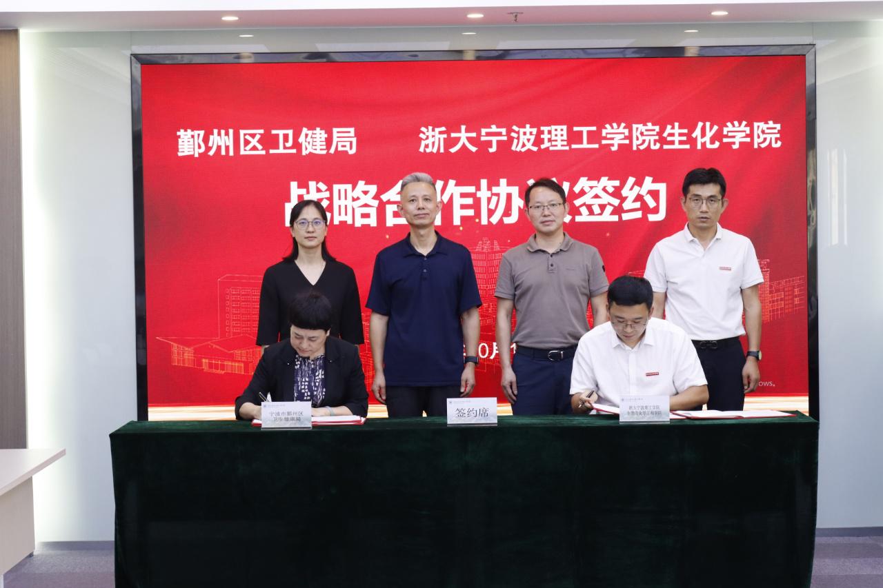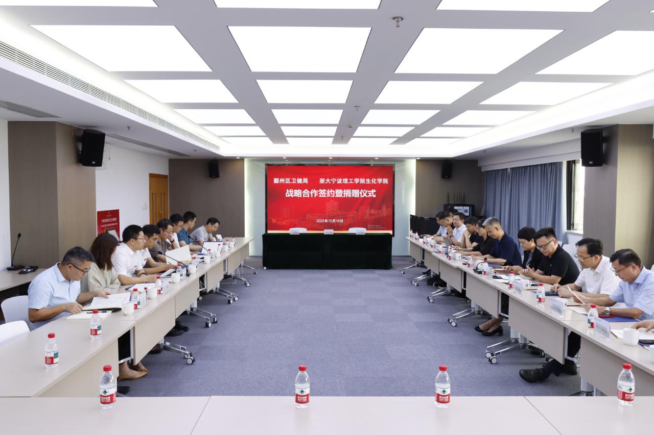 10月16日下午,宁波市鄞州区卫生健康局与浙大宁波理工学院生物与化学工程学院战略合作协议签约暨捐赠仪式在我校举行。学校副校长、教育发展基金会副理事长胡余波,鄞州区卫生健康局副局长、党委副书记朱宇,副局长、党委委员钟维红,鄞州区疾控中心主任江志琴等出席仪式。鄞州区各医院负责人、学校相关职能部门负责人、生化学院领导班子成员参加。生化学院院长侯阳代表学院签署战略合作协议、学校教育发展基金会秘书长张硕代表基金会签署捐赠协议,仪式由生化学院党委书记刘哲主持。