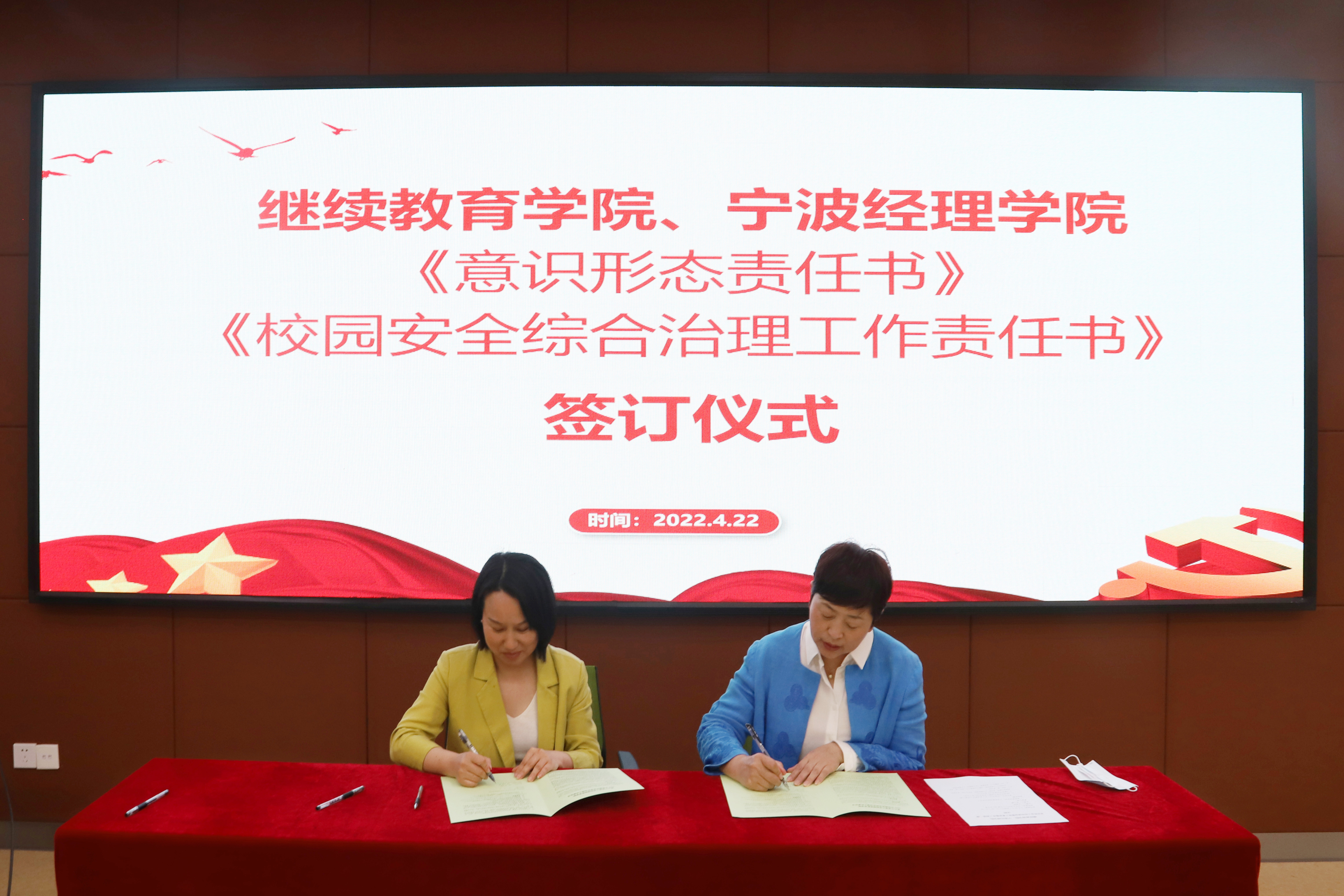 会上,金朝晖、贾小鹏与学院各部门负责人签订《意识形态责任书》和《校园安全综合治理工作责任书》。