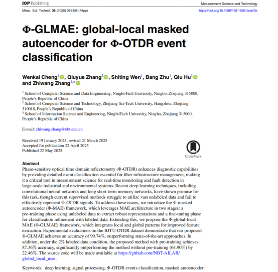 近日,我校计算机科学与技术226班程文恺作为第一作者、张志望老师作为唯一通讯作者、文世挺老师作为指导老师的的研究论文《Φ-GLMAO: global-local masked autoencoder forΦ-OTDR event classification》在国际期刊《Measurement Science and Technology》正式发表。该期刊位列JCR Q1区,并入选ZJU Top期刊名录,代表相关领域的先进科研水平。